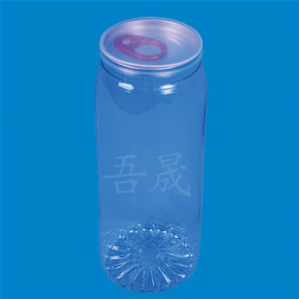 在制作食品易拉罐,塑料罐,透明易拉罐的時候,由于其特征在在于所述的易拉蓋和罐體均由塑料制成,塑料易拉蓋的內(nèi)壁制有凸圈,塑料罐體口部外壁制有相應的凸圈,在封口壓力下塑料易拉蓋的凸圈卡于塑料罐體口部的凸圈下,使兩者緊密扣合,形成密封。由于易拉蓋和罐體均由塑料制成,當需要加熱其內(nèi)的食物時,不可直接放入微波爐加熱。所述的塑料罐體口部制有向內(nèi)的用于與鋁箔片粘合的平面翻邊,鋁箔片粘合在塑料罐體口部的平面翻邊,形成二級密封。所述的鋁箔片為復合層材料,中間層為鋁箔,其上下面各有一塑料薄膜層或膠黏劑層,使其方便與塑料易拉蓋的下表面和塑料罐體口部的平面翻邊粘接。